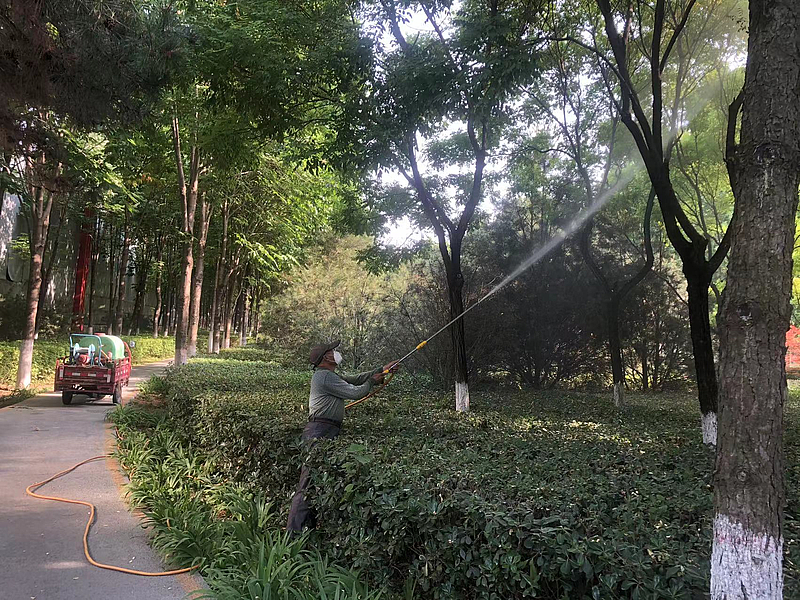 病蟲害防治。堅持“預防為主,防控結合”,持續做好夏季病蟲害防治,進一步加強樹木日常檢查力度,及時發現病蟲害端倪,對樹木、灌木、綠籬以及草坪進行混合藥物噴施,清除病蟲源,有效提升植物自身抵抗力,遏制病蟲害擴散,為灃西市民打造綠意盎然的人居環境。