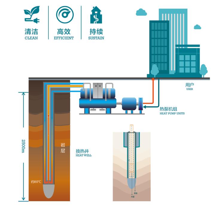 中深層地熱能無干擾清潔供熱技術通過向地下2000-3000m深處鉆孔取熱,運用地熱能梯級利用與智能控制技術,解決游泳中心42%冬季輻射供暖、80%生活熱水、100%泳池池水加熱三大系統熱源問題,實現供暖和熱水系統低碳目標。