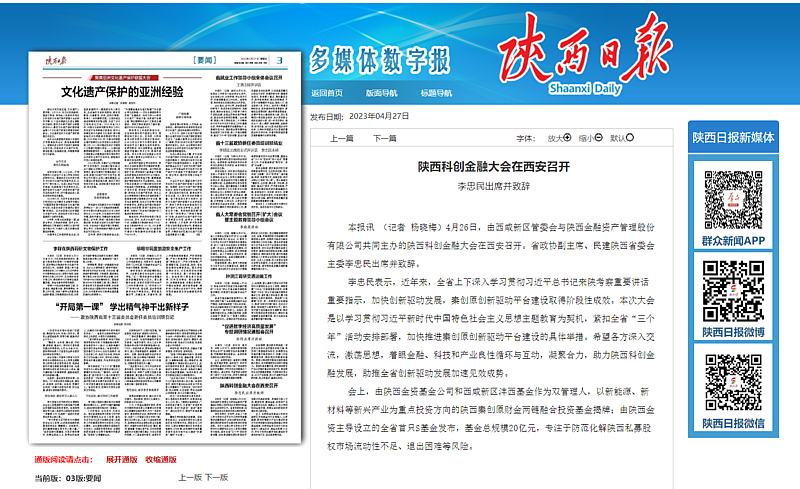 4月26日,陜西科創(chuàng)金融大會(huì)在西咸會(huì)議中心舉辦。本次活動(dòng)由西咸新區(qū)和陜西金融資產(chǎn)管理股份有限公司(下稱“陜西金資”)主辦,陜西金資基金管理有限公司和西咸新區(qū)灃西新城基金管理有限公司承辦,邀請(qǐng)政府領(lǐng)導(dǎo)、金融專家、科學(xué)家、企業(yè)家、投資機(jī)構(gòu)共同探討金融服務(wù)科創(chuàng)、助力秦創(chuàng)原發(fā)展之路,通過(guò)基金揭牌、項(xiàng)目簽約、金融產(chǎn)品發(fā)布等系列重磅舉措為秦創(chuàng)原科技創(chuàng)...